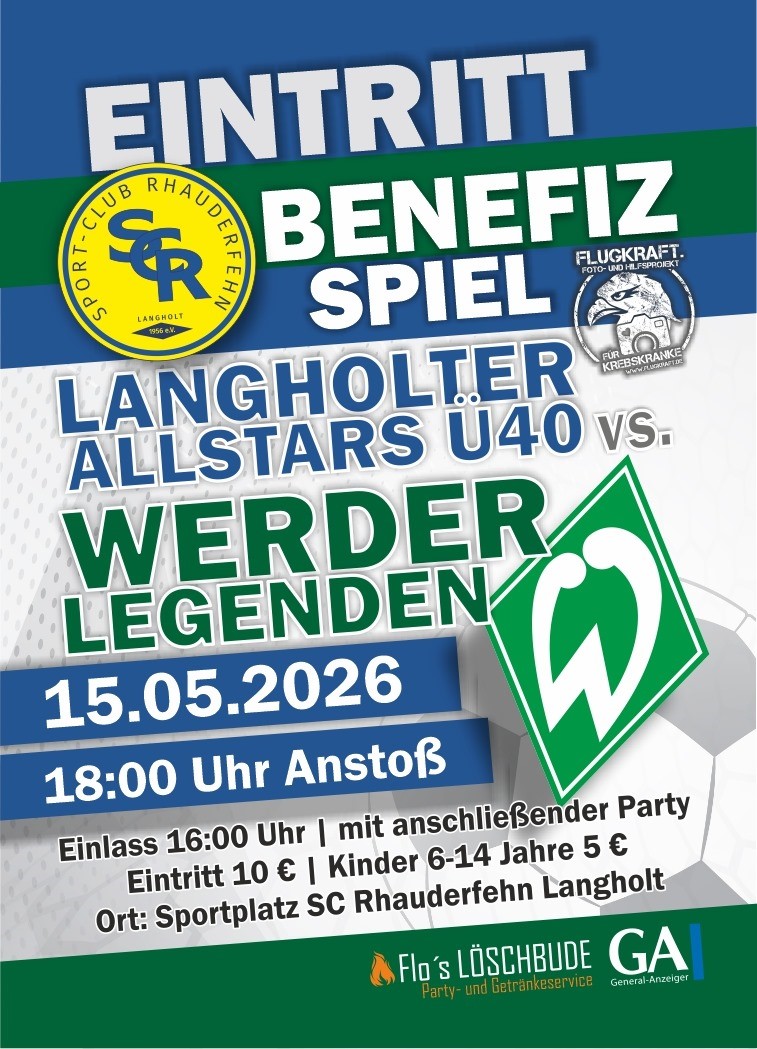 Das wird unser Moment! Direkt nach Vatertag schreiben wir Geschichte. Zum 70-jährigen Jubiläum holen wir Werder-Legenden auf unsere Sportanlage nach Langholt. Echte Stars. Echte Bundesligaprofis. Echte Fußballmomente – und sie kommen zu UNS! Dieses Benefizspiel ist mehr als nur Fußball: Es soll ein Zeichen sein, was für eine Gemeinschaft Langholt sein kann. Der Überschuss geht an unsere SCR-Jugend und an Flugkraft. Wir setzen uns für Kinder ein und unterstützen den Kampf gegen Krebs.